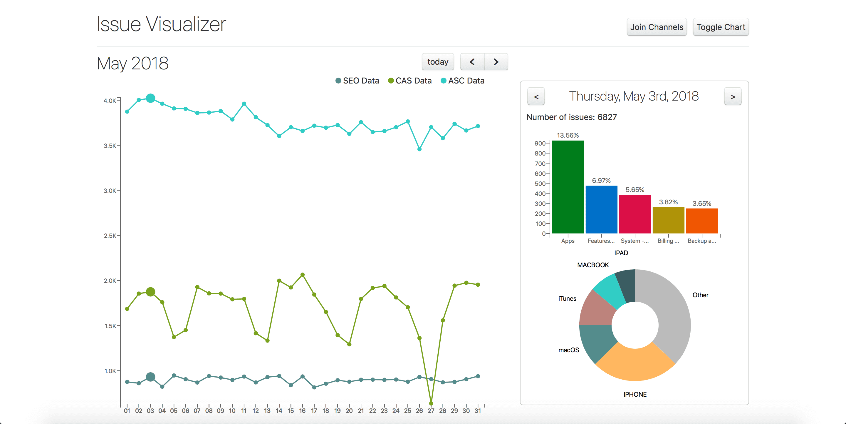 During the summer of 2018, I was a software development intern at Apple. My team worked on several internal tools for the Apple Support ecosystem. One project the team had not gotten around to was a visualization tool for analyzing data from our different support channels. I decided to take this on as my internship project.