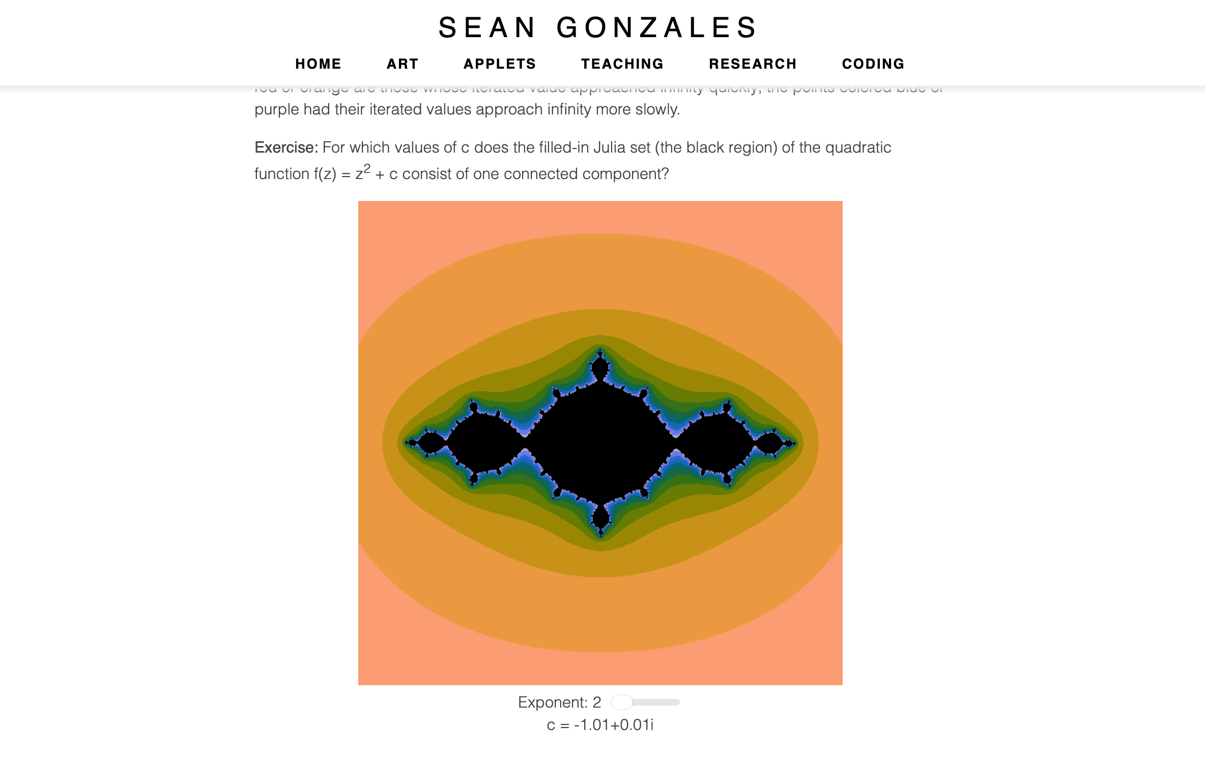 One aspect of my website which I hope to expand soon is the applets page. I love using my software experience to make interactive online tools for math discovery. The above image shows the Julia sets applet I made, which allows the user to explore different Julia sets using their mouse and a slider.